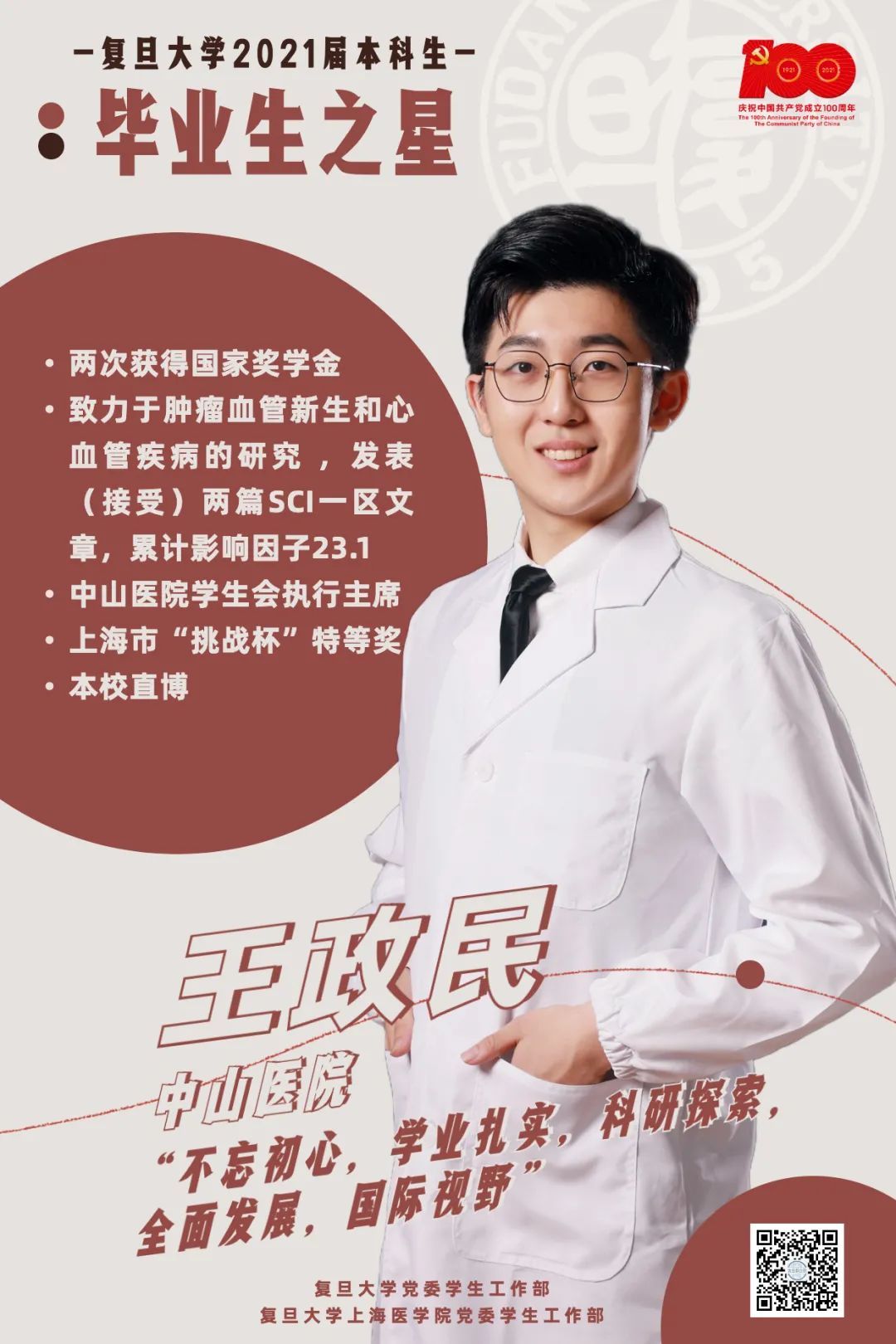 五年学习成绩位居中山班第一,先后获得了两次国家奖学金、复旦大学一等奖学金、克卿优秀医学生奖等,荣获上海市优秀毕业生,复旦大学优秀学生标兵,复旦大学优秀学生干部标兵,并成为复旦大学“卓博计划”的首届学员,作为一名“医五代”,扎实的专业知识让他向着“不再让病人无奈地走出病房”理想不断迈进。他目前发表中科院一区SCI两篇,其中第一作者一篇,累计影响因子23.1分,相关学术成果在“挑战杯“上海市决赛中荣获特等奖,也受邀前往法国里昂在国际顶级会议14th 欧洲神经肿瘤学年会(EANO)做壁报展示,发表一作摘要文章于Neuro-Oncology(IF=10.21),此外还有两篇文章在投。成长路上他将所学不断转为实践,王政民参加的复旦复生人工智能医学影像诊断的创业项目获得了全国创新创业大赛银奖。作为中山医院学生会主席,王政民也在积极开展备受同学喜欢的医学生特色活动。带着对医学的热爱,未来他直博本校,师从我国心血管领域的权威、中山医院心内科葛均波院士,以期实现自己心中的医学梦想。