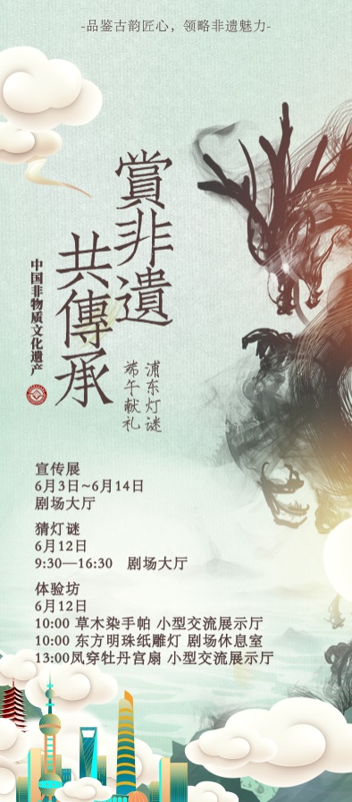 在浦东文化馆浦东新舞台大厅与尚悦湾广场内,“领略非遗魅力”浦东非遗宣传展通过图文介绍、视频宣传以及实物展示等多种方式,让市民提高保护和传承非遗项目的意识。尚悦湾于6月12日至14日,浦东文化馆仅限6月12日当日,还将开启端午灯谜互动,猜对首中者经工作人员核对,可领取小奖品。值得注意的是,在建党百年之际,此次大部分灯谜的谜底或谜面,与党史知识有关,以此助力党史学习教育。