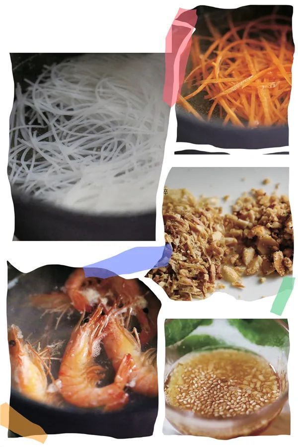 5. 檬粉上依次摆放黄瓜丝、红萝卜丝、白虾、九层塔、薄荷、花生碎、干红葱头碎,淋入作法4的拌面调料,充分混合均匀后即可。