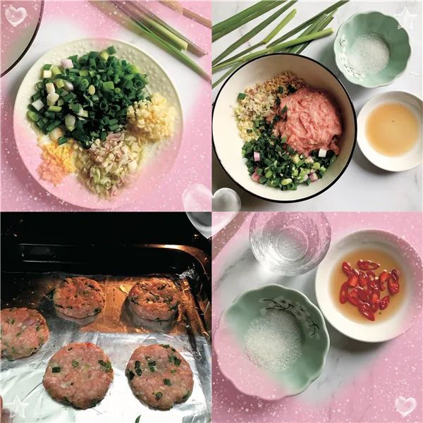 3. 将抓匀的猪肉末做成5~6个小圆饼,放入垫铝箔的烤盘,175°C 烤20~30分钟。