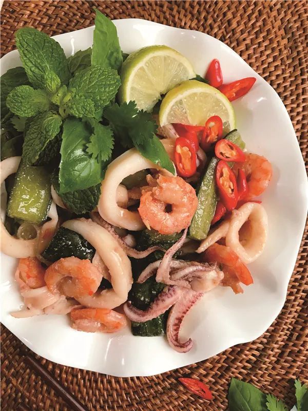 这是典型越南沿海特色菜肴。新鲜的海鲜配上黄瓜,荤素搭配、营养丰富,清新顺口。