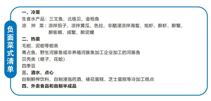 农村集体聚餐固定场所不得经营生食水产品,毛蚶、泥蚶等蚶类,蛏子、花蛤等贝壳类,四季豆,青占鱼,野生河豚鱼或非养殖河豚鱼加工企业加工的河豚鱼,凉拌茄子,凉拌黄瓜,色拉,非醋浸凉拌海蜇,炝虾,醉虾,醉蟹,醉蟛蜞,咸蟹,醉泥螺等菜式。