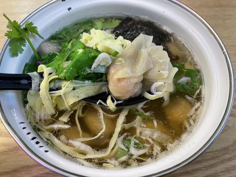 话不多说,先点上一碗柴爿虾肉小馄饨。刚上桌,就自带浓浓怀旧风,再配上虾米紫菜和蛋皮,只需一眼,儿时的记忆翻涌。 一个个软软的小馄饨漂浮在汤里,晶莹剔透,跟泡泡似的,好吃颜值又高, 轻盈鲜滑!