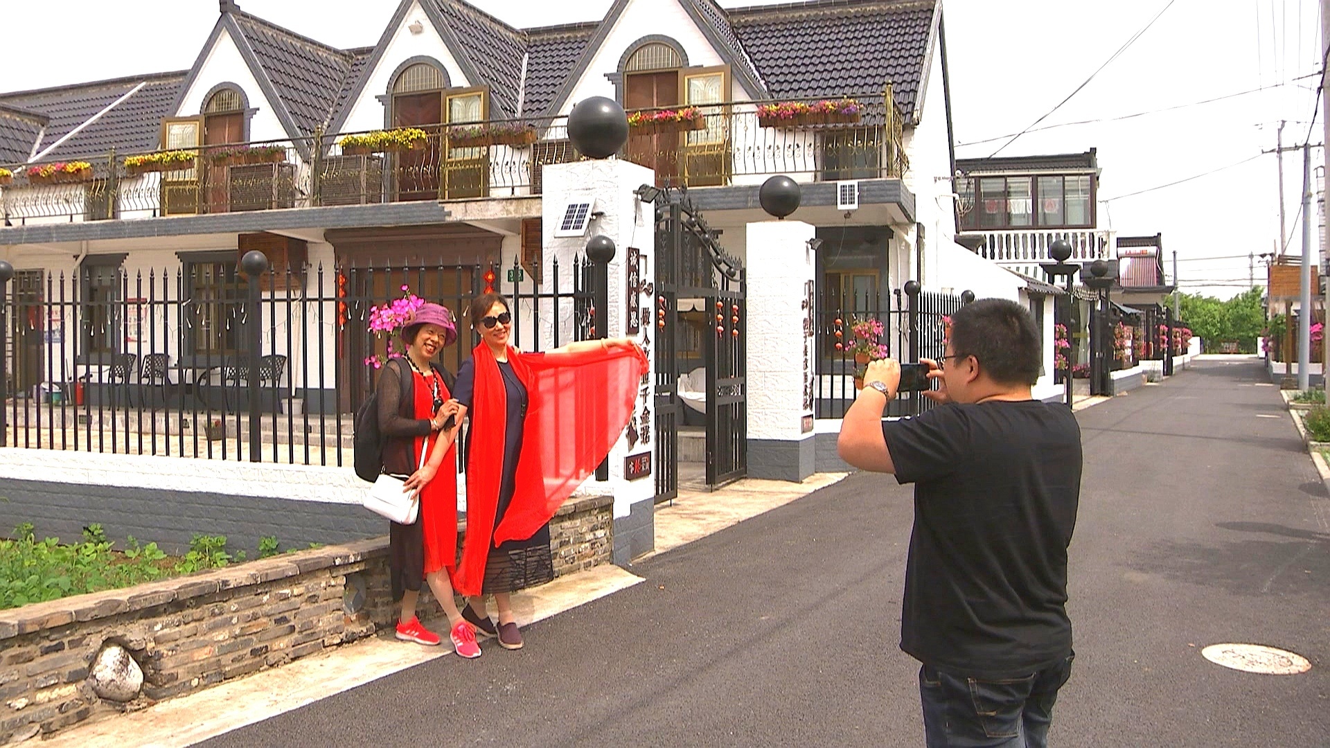 在顾伯伯农家乐,几位入住民宿的游客在赶着去花博园的空隙,不忘和美丽的花村花宅合影留念,记录下崇明春日的美景。