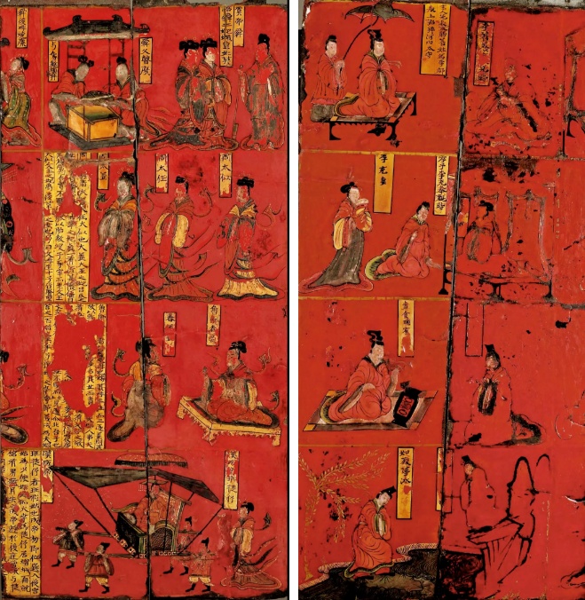 1965 年,山西大同石家寨发现了建于北魏延兴四年(474)、第二次掩埋于太和八年(484)的琅玡王司马金龙夫妇合葬墓,墓中出土了一件制作异常精美的彩绘漆屏风及四件雕刻精致的石柱础。这件漆屏风,见于后室东部棺床的前方,发现时已严重朽毁,残片散落于各处,仅有五块屏板保存相对完好,高81.5厘米,宽26厘米,边框宽约6.7—6.8厘米。学界原本认为屏风背部合计一共应有六块屏板及其边框,其整体宽度应在200厘米以上,刚好可以安放在长度为241厘米的石床上;认为像这样一种后六块、两侧各三块的围屏,符合文献所记的“十二牒”。但根据最新的研究,这件半包围结构的屏风应是由多块小板拼合起来的左、右、后三块大板构成,确系安插在石床上方,但谈不上与“十二牒”相近;而且四件石柱础当是支撑围屏上方帷帐的基座。屏风的正面(内立面)和背面(外立面)皆有彩绘漆画,分上下四层,每幅皆有文字榜题,有趣的是部分故事画面当中也出现了屏风的图像,有助于理解这件实体屏风的使用方式。从总体上看,屏风正面的表现题材为列女,计有《有虞二妃》《启母涂山》《周室三母》《鲁之母师》《鲁师氏母》《孙叔敖母》《卫灵夫人》《蔡人之妻》《黎庄夫人》《班女婕妤》等画面,内容大都出自汉代刘向的《列女传》——刘向于《七略别录》中说:“臣与黄门侍郎欲以《列女传》种类相从为七篇……画之于屏风四堵。”是知以列女图装饰屏风的传统衍自汉代宫廷,而且直到顾恺之和司马金龙所处的时代还在上流社会流行不衰;屏风背面所绘内容为古贤、高士和孝子,保存较好的有《齐宣王与匡青》《孝子李充》《素食赡宾》《如临深渊》《如履薄冰》等画面。这两类漆画装饰题材皆充满了儒家的伦理道德色彩,从中隐约可见汉代文化伴随着北魏汉化政策的初步推行而再度升温;而且,其装饰题材分布上的男性在外(外立面)、女性在内(内立面)也显得别有深意。不过,墓中出土的莲花纹石柱础及其上方透雕的山峦、翔龙和伎乐天人,还是透露了当时佛教文化的浓郁气息。总之,如果说这类屏风原本有可能曾经作为司马金龙府邸中物,屏风上的历史故实曾被他用作体现或规范自己个人品德追求的“座右铭”,那么当它被埋在了地下,其意义也随即转变为对其平生行为与道德情操的旌表。