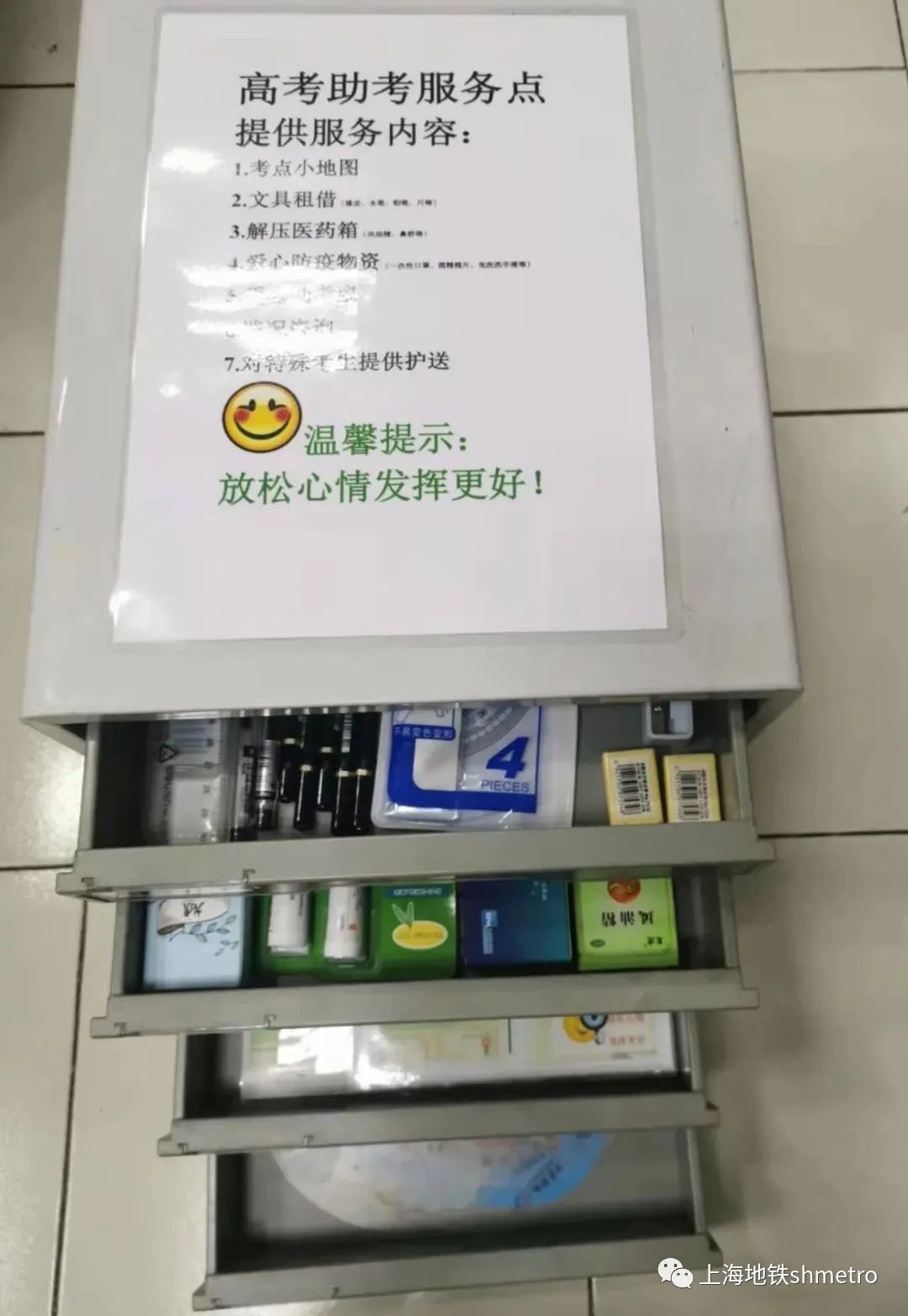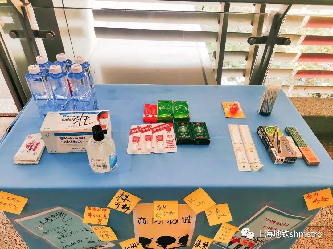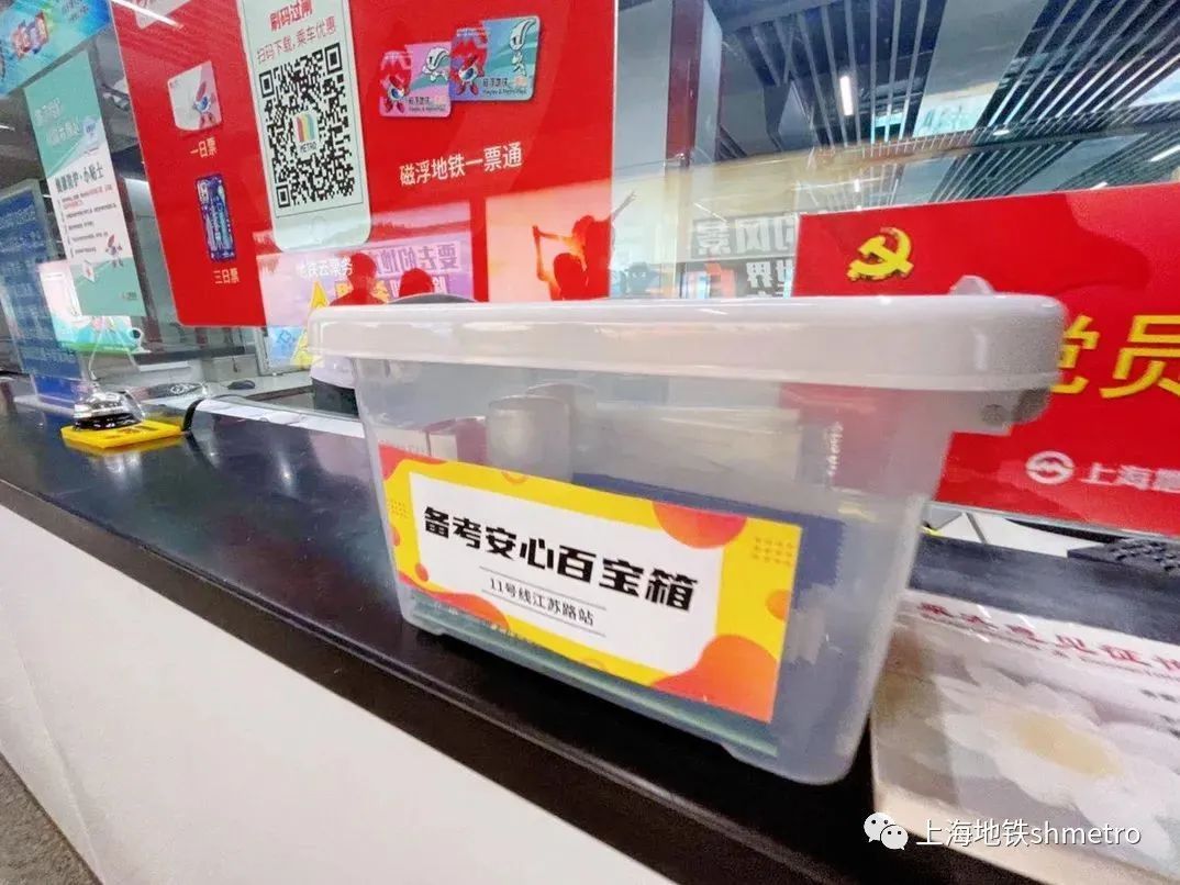 11号线嘉定北站、真如站、江苏路站专门设立备考安心百宝箱,备有考试专用2B铅笔、黑色中性笔、消毒湿巾、免洗洗手液、清凉油等,方便考生免费借用,助力高考学子。