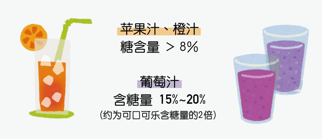当新鲜水果被榨成果汁后,水果中含量本就很高的糖类物质会被保留下来,而且往往一杯果汁需要好几个水果,这也就意味着一杯果汁浓缩了几倍的糖分。常见的果汁如苹果汁、橙汁的糖含量都在8%以上,而葡萄汁的含糖量甚至可高达15%~20%,几乎是可乐饮料含糖量的两倍。