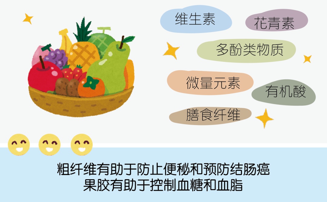 水果中的主要成分除了水和糖外,还有多种维生素、多酚类物质、微量元素等营养物质。另外,吃水果的重要的一个目的之一就是补充膳食纤维,因为水果中含有极丰富的粗纤维和果胶。