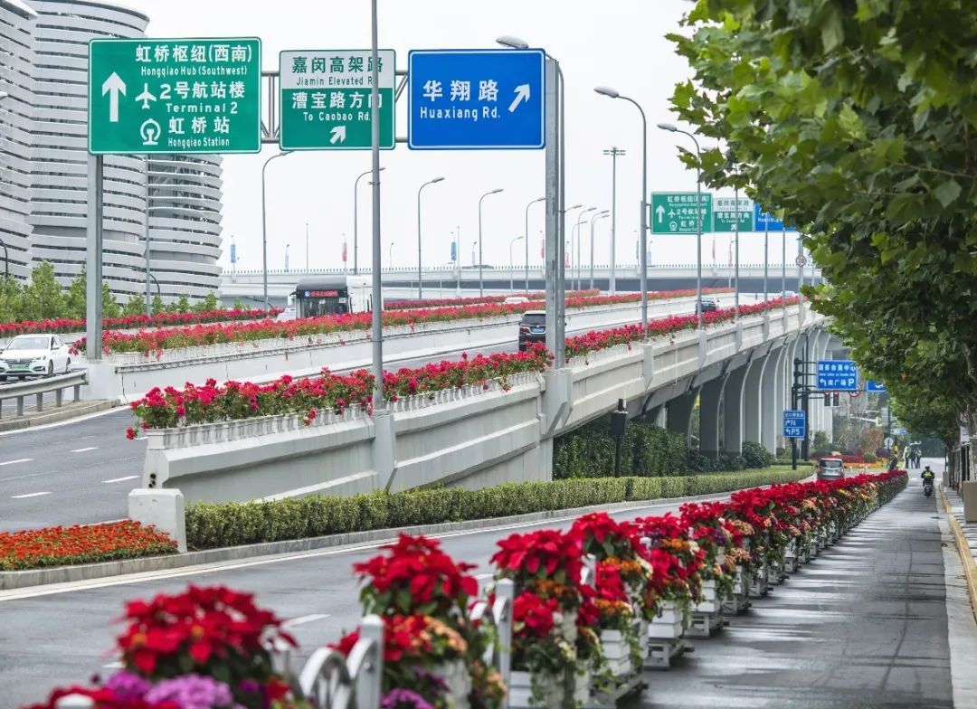 进博会核心区是上海市容景观展示区,南广场摆花成为进博会标志性景观。绚丽精彩的绿景,结合场所文化的景观城市公共艺术,凸显了大气、优雅的“上海之门”城市形象,喜庆的景观照明展示“七彩虹桥”的迎宾夜间氛围,花景、绿景、光景空间创造了“海上新风景”。