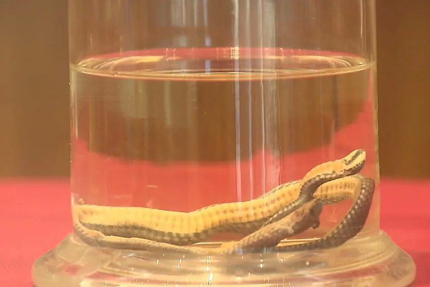 走进展示大厅,映入眼帘的是大金山岛的沙盘模型,真实还原了岛屿外观模样及岛上基础设施。整个展厅分为植物标本、动物标本和岩石标本三大区域,共展出百余件。其中有不少上海地区不常见,仅在大金山岛上独有的动植物让大家大开眼界,如野生的灵芝、天竺桂等,而像这种头尾相似的钝尾两头蛇在上海地区也十分罕见。