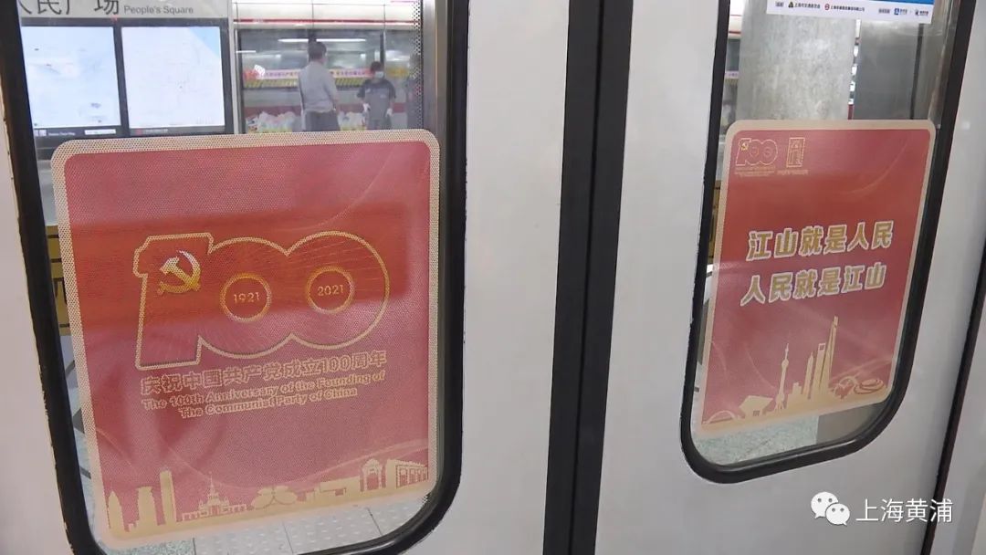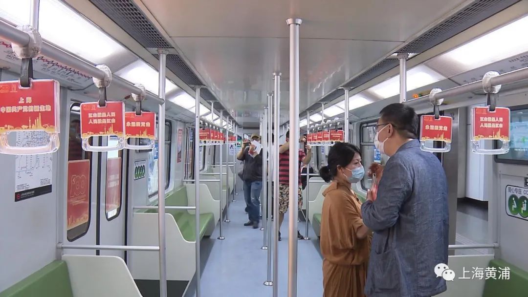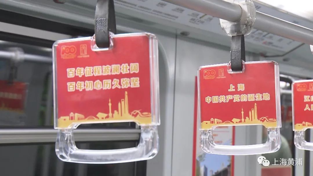 在1号线红色主题专列上,整个车厢内部装饰一新,所有的扶手上都装饰上了红色标语,车厢内部车窗、广告位等都张贴了关于一大会址等红色景点的海报。