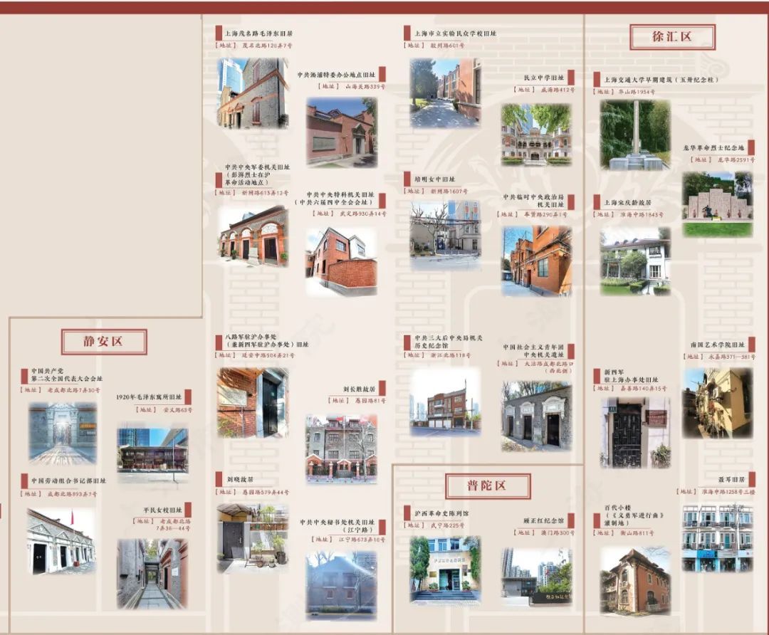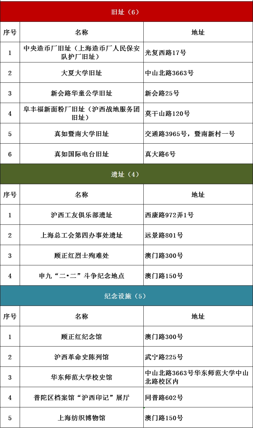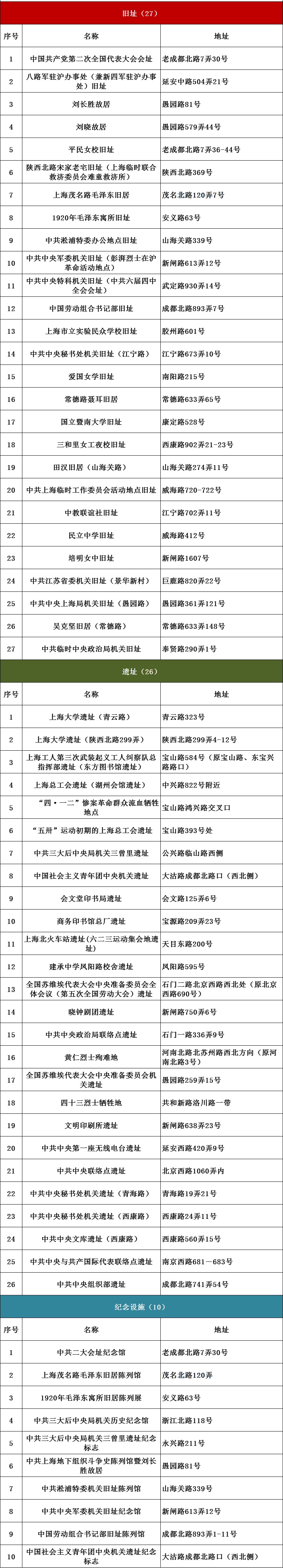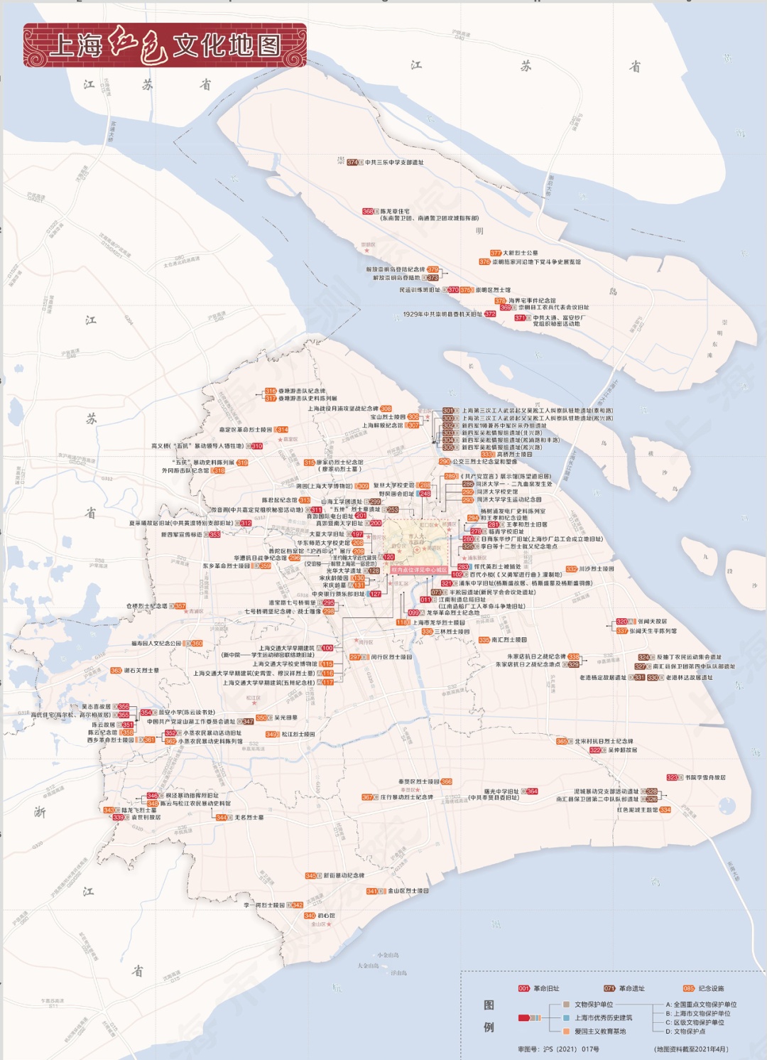 在“文化和自然遗产日”到来之际,市文旅局发布了《上海红色文化地图(2021版)》,其中包括:革命旧址195处,革命遗址83处,纪念设施101处。地图主图正面标注379处点位,背面印制100个重要点位的图片,附图正面设计了6条红色资源寻访路线。详见↓
