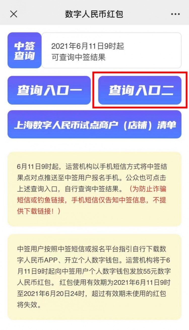 1、已经报名参加此次活动的公众点击“上海发布”微信公众号“市政大厅”中的“数字人民币红包”进入活动页面,点击“查询入口二”。