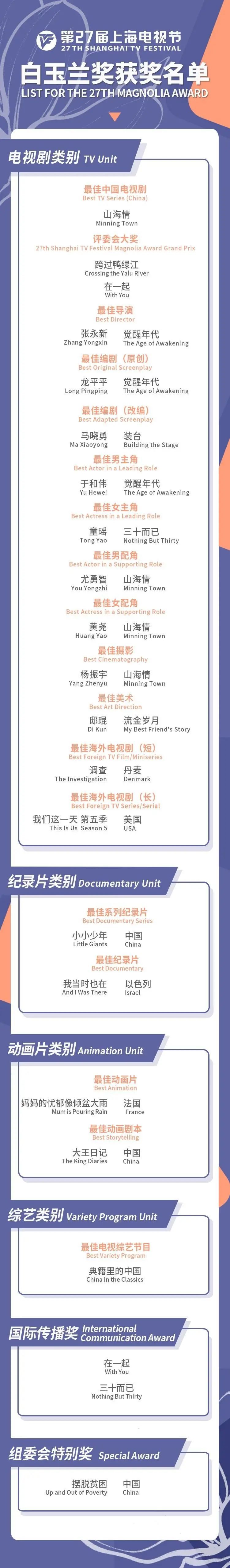 6月10日晚,第27届上海电视节白玉兰奖在沪揭晓,《山海情》获得最佳电视剧、最佳男女配角、最佳摄影奖等四个奖项;《觉醒年代》获最佳导演、最佳男主角、最佳编剧等三个奖。演员于和伟(《觉醒年代》)、童瑶(《三十而已》)分获最佳男女主角。