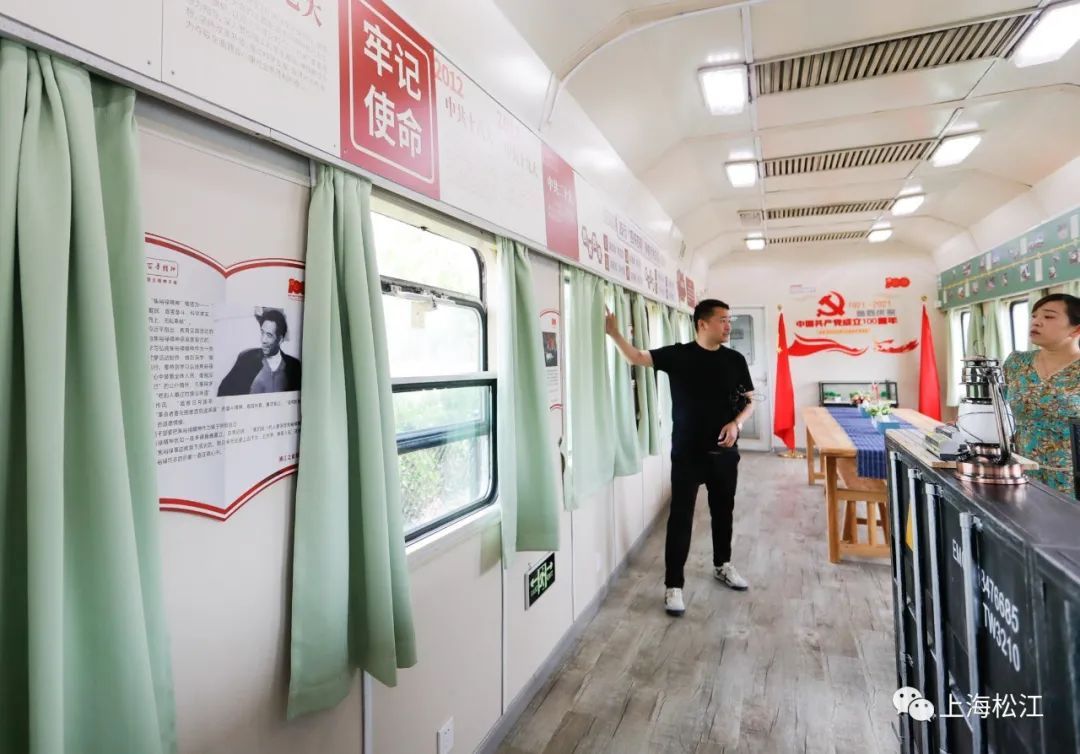 在靠前的一节车厢中,一面特别的文化墙吸引了不少人驻足停留。结合了党史学习教育,车厢打造“党史文化墙”以及红色影片展播区域,为游客构筑了“红色风景线”。另一面的墙上还展示了火车发展史,交通工具的发展让游客感叹百年巨变。