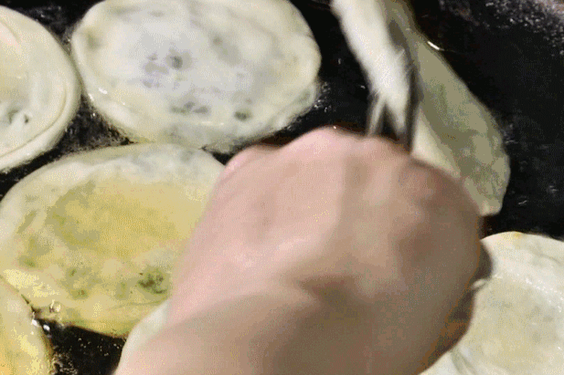 他家的葱油饼要比我们想象中的肥胖酥软一些,曾有食客戏称它为“中国版吐司”。作为十几年前上海葱油饼届的“老网红”,一天卖掉三四千只都不在话下。就算如今每每路过穆氏,想买份葱油饼吃,总是免不了要排队等候。就连煎锅也和外头的画风不同:用生煎锅只油煎不烘烤。