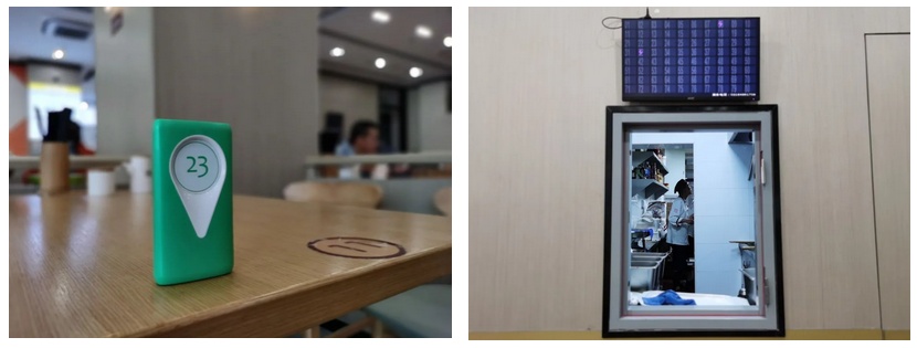 除了点餐、结算中提供的智能服务外,在用餐期间,社区食堂也有着不少贴心的智能服务。比如在居民点了面类和汤包等需要随时制作的餐点时,工作人员会给到他们一个餐号牌,它与普通的餐号牌可是大有不同的。这个餐号牌具有感应功能,即居民落座在餐厅内的任何桌位,它都可以感应并将对应桌号上传至送餐后台,在餐点完成后直接根据系统平台显示的对应桌号,工作人员可精准送餐,无需绕场寻找,也不用大声叫号。还有大堂的实时监控屏,让居民在用餐时,可以对后厨情况一目了然,吃得更加放心。