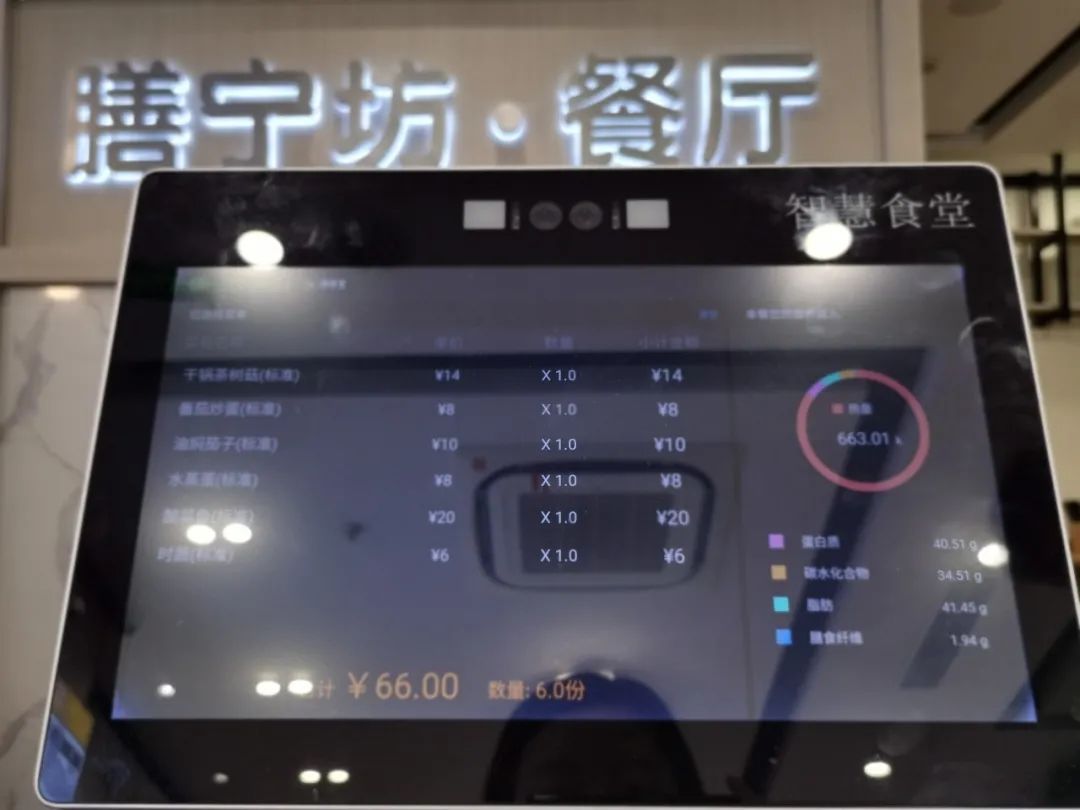 “这个智能结算台可以说是我们整个智慧餐厅最核心的操作台。”社区食堂负责人孔然告诉“宁宁”,餐厅内提供的即时结算、热量识别、刷脸支付等功能都是通过智能结算平台完成的。即居民在完成选餐后,只需将盛放着丰富菜品的餐盘放置于结算区,无需等待工作人员一一核对和计算价格,屏幕上即可实时显示所选餐点的名称、价格以及总热量。
