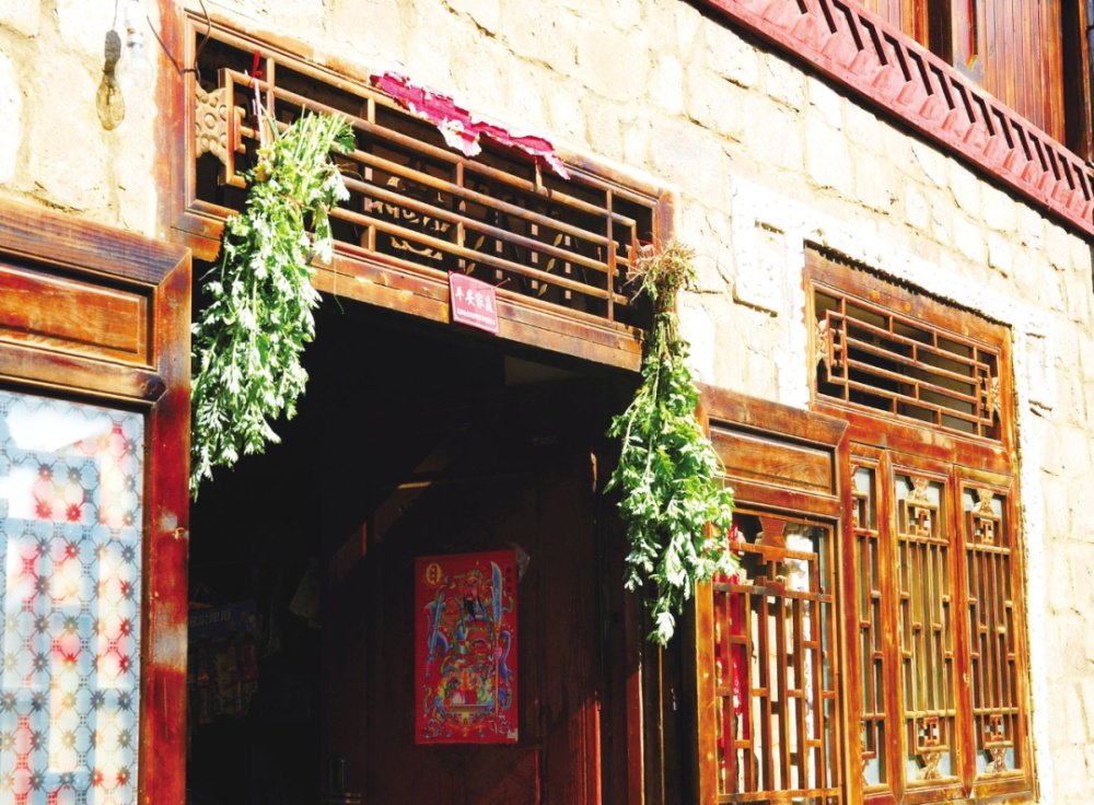 端午节在门口挂艾草、菖蒲(蒲剑)或石榴、胡蒜,都有其原因。通常将艾、榕、菖蒲用红纸绑成一束,然后插或悬在门上。因为菖蒲天中五瑞之首,象征驱除不祥的宝剑,因为生长的季节和外形被视为感“百阴之气”,叶片呈剑型,插在门口可以避邪。所以方士们称它为“水剑”,后来的风俗则引申为“蒲剑”,可以斩千邪。清代顾铁卿在《清嘉录》中有一段记载“截蒲为剑,割蓬作鞭,副以桃梗蒜头,悬于床户,皆以却鬼”。