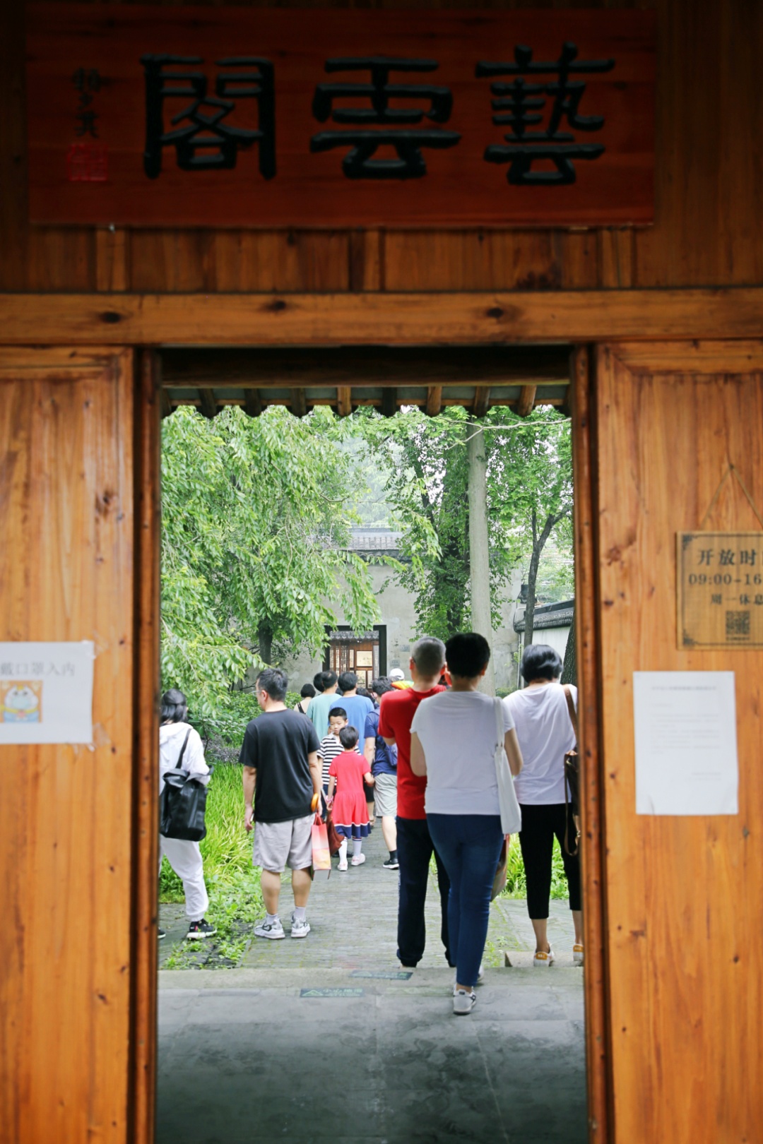 “艺云阁文化艺术空间”位于仓城老宅“王氏宅”。王氏宅占地1200平方米,原为明代朱御史宅基地,后依次易手顾、陆、王三氏。抗战前,王子彝买下该宅,1937年再修仪门,新建了前厅,故王氏宅又称王子彝宅。仪门始建于明代,青石门枕石,东西两侧为明代砖雕,王子彝长子王尚德据《大学》《中庸》拟定、王子彝镌刻匾额“庄敬日强”,意为“要有庄严持重、敬慎严谨的态度,才能进步自强”。
