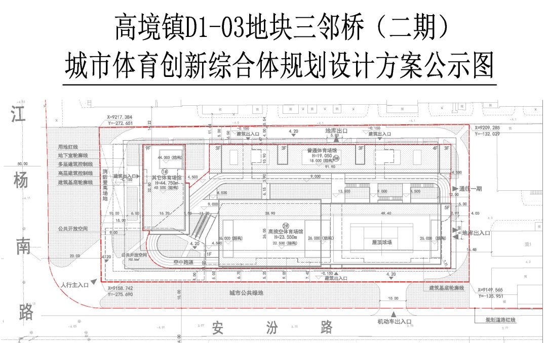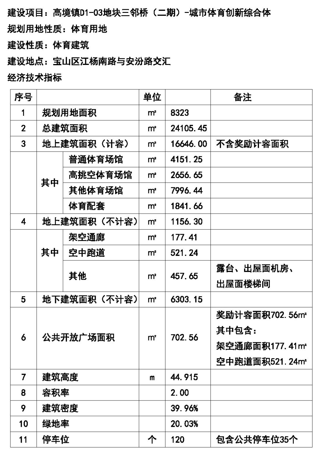 据了解,三邻桥(二期)城市体育创新综合体建设地点位于宝山区江杨南路与安汾路交汇处,规划用地面积为8323㎡,总建筑面积为24105.45㎡,规划设有普通体育场馆、高挑空体育场馆、架空通廊、空中跑道等设施。计划建设停车位120个,包含公共停车位35个。