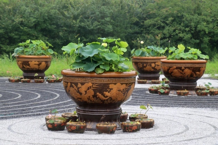 陆上展区以自然的种植形式结合人工水景,通过浅灰色砾石散铺等硬质设计,搭配自然草坡、中式景石植物组团,设置精品荷花小池塘、睡莲池塘,结合缸栽莲花及碗莲,全方位、多角度展现精品荷花、睡莲的美轮美奂。