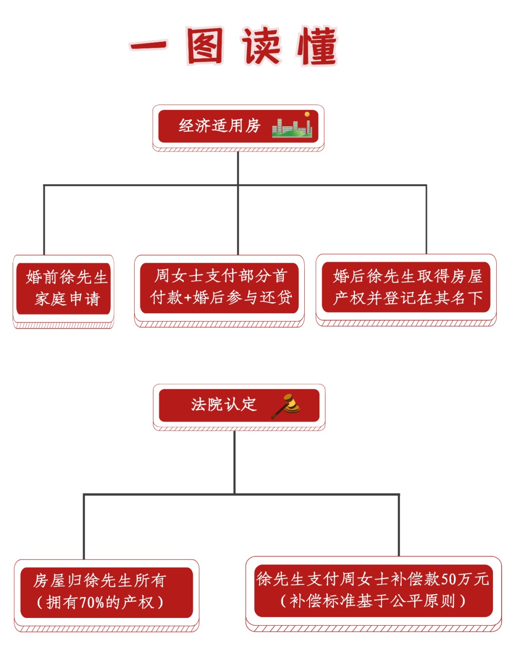 本案中,经济适用房虽不是夫妻共同财产,但周女士用婚前个人财产支付大部分首付款的出资应视为一种债权行为,并可就此获得相应补偿。对于补偿标准,因周女士不具备购房资格,经济适用房的购买价又远低于市场价,如按照一般夫妻共同财产分割中的处理原则,将使得出资方在离婚分割时享受到目前高房价下带来的增值部分,无疑与另一方作为低收入群体当初申购经济适用房以解决其居住困难的初衷背道而驰。对此,法院综合考虑了房屋来源、首付款支付情况、贷款偿还情况、房屋目前价值等情况,以公平为原则,在低于按夫妻共同财产分割的数额下合理确定对另一方的补偿金额。最终,法院确定徐先生于判决生效后十日内支付周女士补偿款50万元。