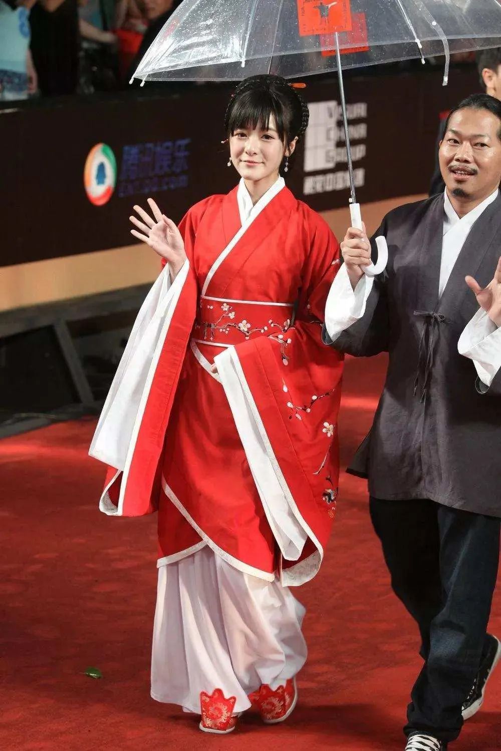 第16届上海国际电影节闭幕式红毯上,身着汉服的徐娇与方文山一同亮相
