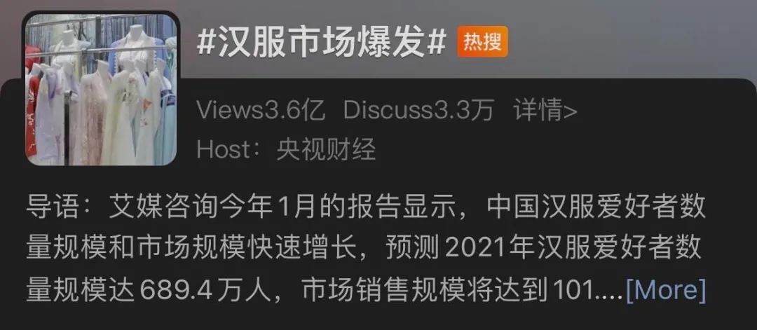 不久前,#汉服市场爆发#的话题更是直接登上了热搜。有数据预测,2021年汉服爱好者数量规模会达到689.4万人,市场销售规模将至101.6亿元。