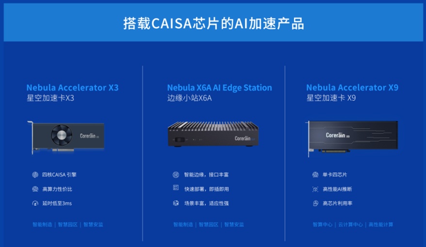 基于自主研发的定制数据流架构,CAISA在芯片利用率上实现了技术突破,打破了算力提升对芯片制程工艺的高度依赖,为行业客户提供了更具算力性价比的芯片产品选择。目前,鲲云科技已经发布基于CAISA的多款数据流AI计算平台,包括星空加速卡X3、星空边缘小站X6A及星空加速卡X9,满足边缘和高性能场景中的AI计算加速需求,应用于智慧安监、智慧油田、智能制造、智慧电网等领域,大幅降低客户的AI应用落地成本。