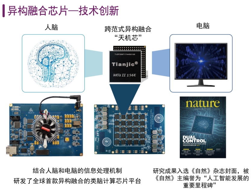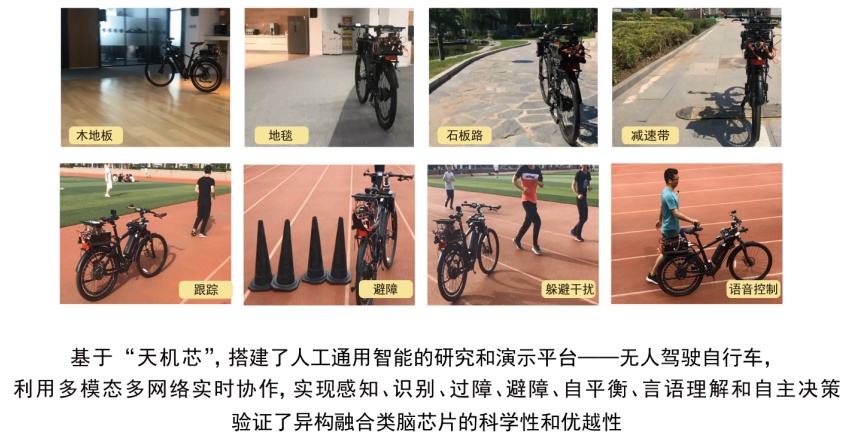 本项目将计算机科学导向的机器学习和脑科学导向的神经形态计算进行跨范式异构融合的类脑计算学术思想,研制了对应架构的天机芯片支撑人工通用智能发展,并演示基于天机芯的无人驾驶智能自行车平台。天机芯及平台相关成果以封面论文发表于《自然》,入选2019年两院院士评选中国十大科技进展、中国科学十大进展和15项世界互联网领先科技成果,并孵化了北京灵汐科技有限公司推动类脑计算技术的产业转化,目前已实现芯片量产。
