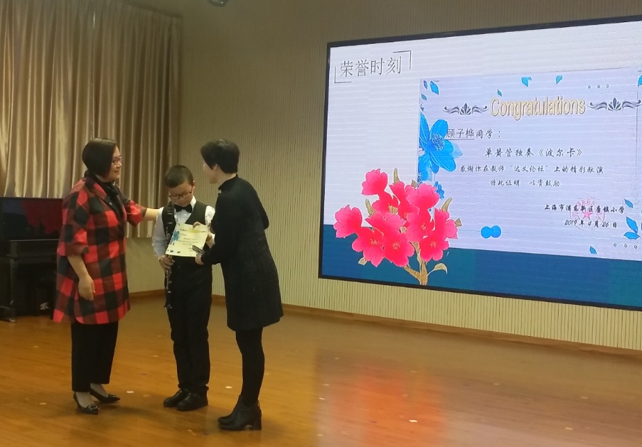 虽然离开唐小校园已两年,2019届毕业生顾子桦至今记得小学生涯最高光的时刻——临毕业前,他受校长之邀,带着心爱的单簧管走上“达义论坛”,为全校老师表演了一曲《波尔卡》。作为校管弦乐队的首席,他曾有过多次大型演出的经历,但这一次,显然与众不同。一曲终了,娄华英校长为他颁发了纪念奖状,还请他的妈妈上台一同合影。“特别感谢校长的用心安排,让原本内向的孩子越来越有自信。” 顾子桦妈妈说,虽然全家已从上海返回安徽生活,却一直保留着那张照片和奖状。