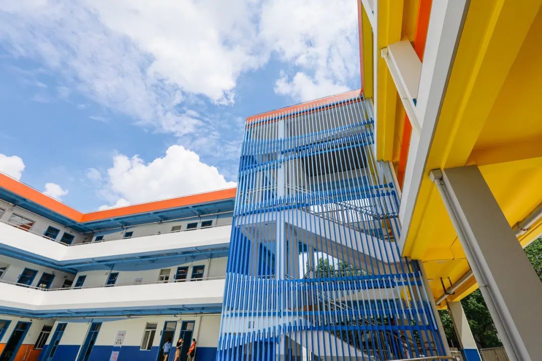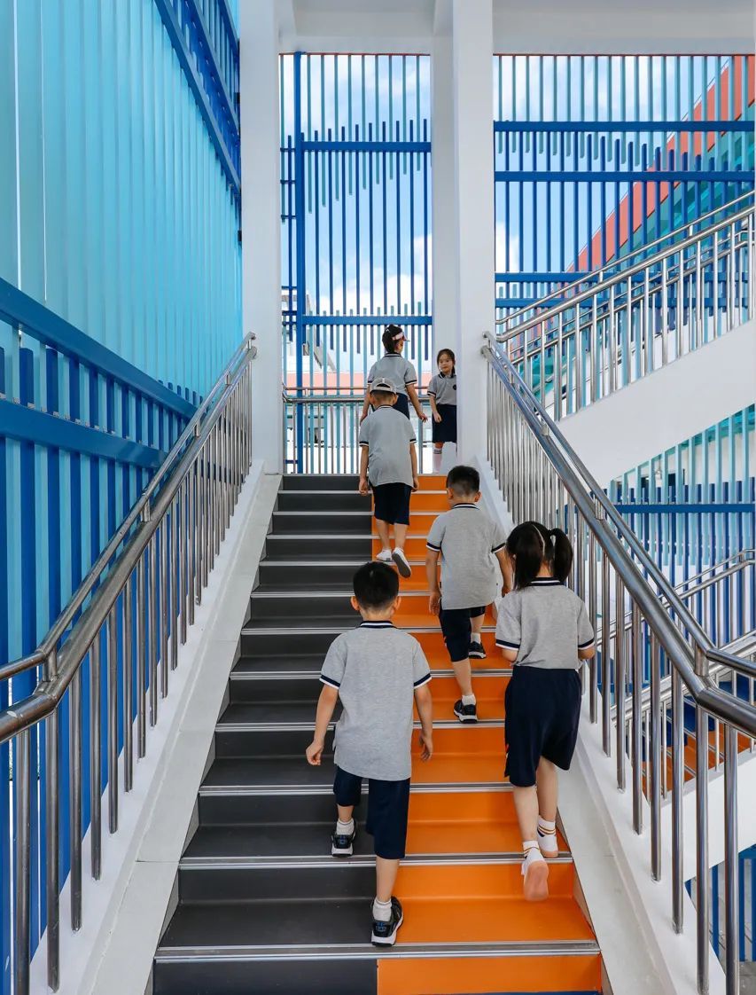 原本裸露外伸的楼梯装上了全封闭护栏,宛如一方蓝色池塘在校园里荡漾。教学楼的楼梯橙蓝两色各占一半,自然而然引导学生“上下楼分道而行”。