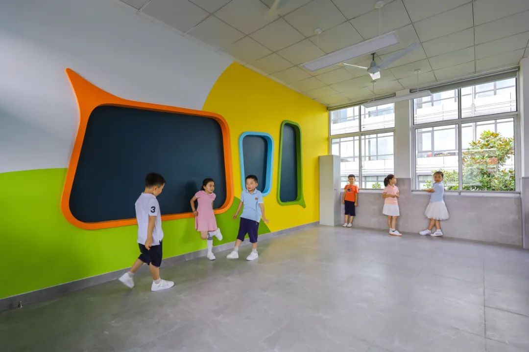 拾级而上,每一间教室都迥异于传统小学灰白的色调:蓝色或黄色教室大门上,三块圆形玻璃替代了传统的方框式透视窗,俏皮可爱,平添了一份灵动;淡绿色的桌椅和墙面呼应;教室后墙上,橙色、蓝色和绿色三个“对话框”取代了传统黑板报,组成一幅“会说话的班级文化墙”。