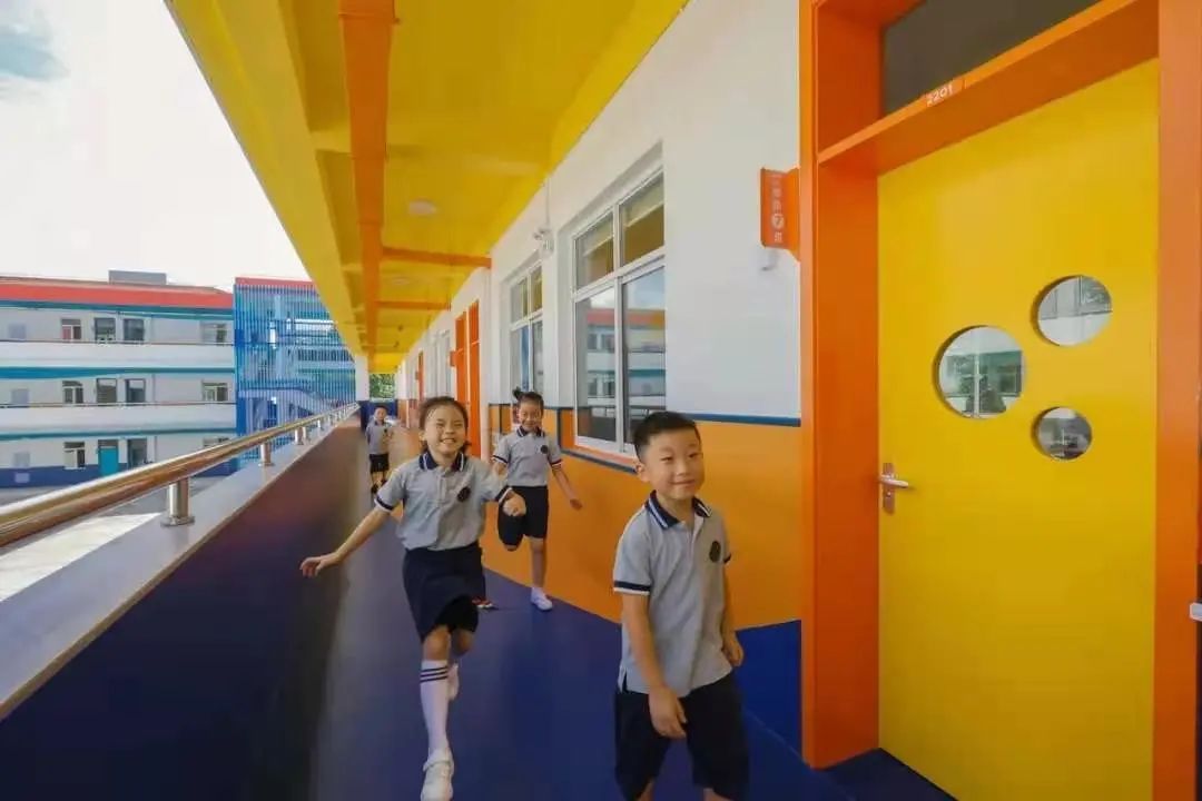于是,他们将师爱融入设计,让色彩点亮师生的生命成长。暖色系的南楼契合低年级学生好动活泼的特点,冷色系的北楼则为高年级学生打造深度思考的环境;安全体验教室和室外图书馆有机融合,美术教室、信息科技教室、音乐教室营造美的空间;操场上的讲台添置了主题式背景板,左右两侧还特地做了两扇金色小门,好让每个上台的孩子,都能感受到满满仪式感和荣誉感;大理石花坛上新添了原木长凳,方便师生在花园里聊天谈心,等候管弦乐队队员放学的家长也能在此小坐休憩……