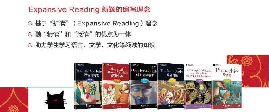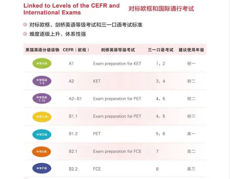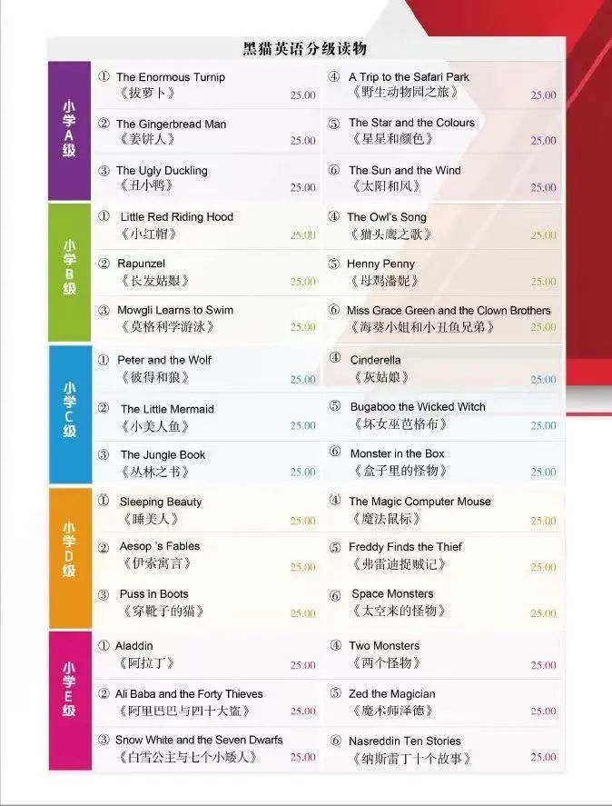 “黑猫英语分级读物”根据“扩读”(Expansive Reading)的理念编写而成,整个系列含小学和中学两个学段,共分11级。其中,小学段分A—E5个级别,每个级别6本,共30本。