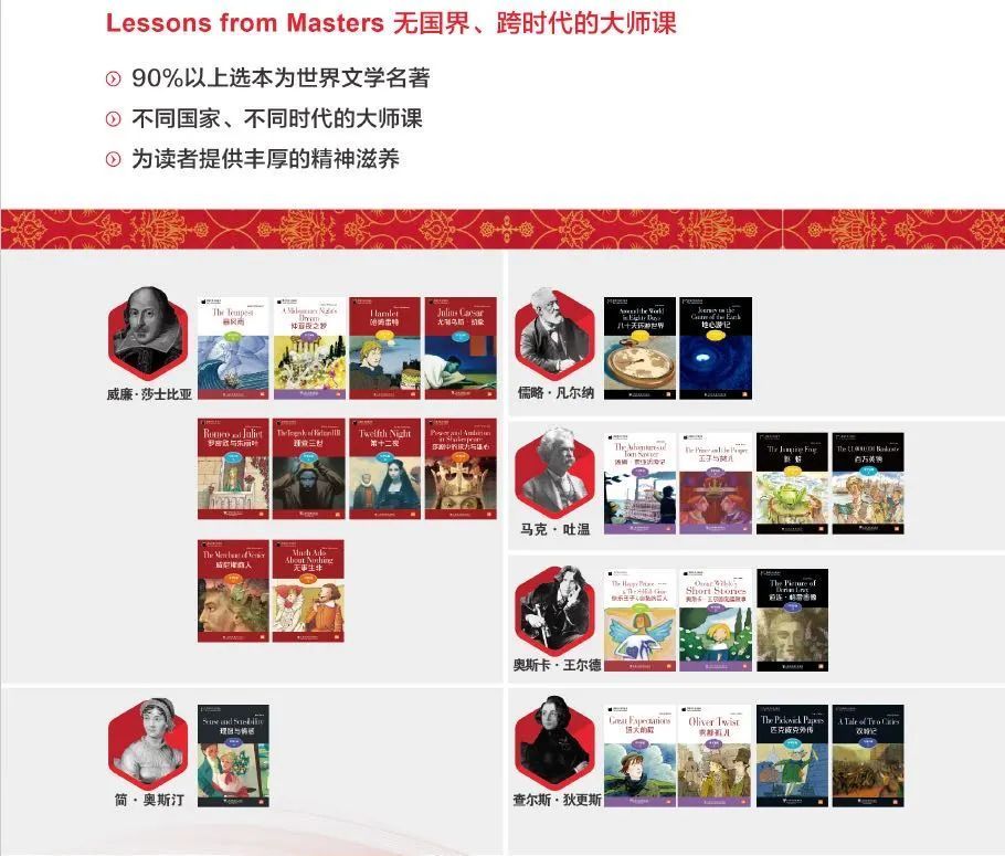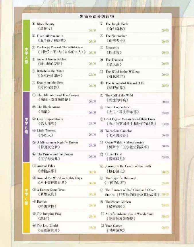 中学段“黑猫英语分级读物”以经典名著改编本为主,也有少量当代原创作品。每本读物包含:经典名著改编本或当代原创作品,丰富的百科类阅读文本,以及大量语言学习活动和习题。每本读物都配有分角色、剧场化的MP3音频供下载使用。