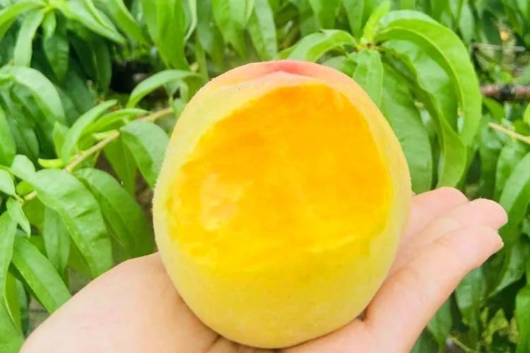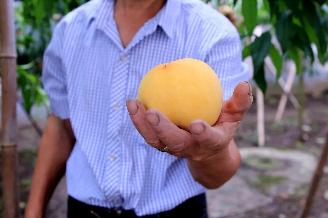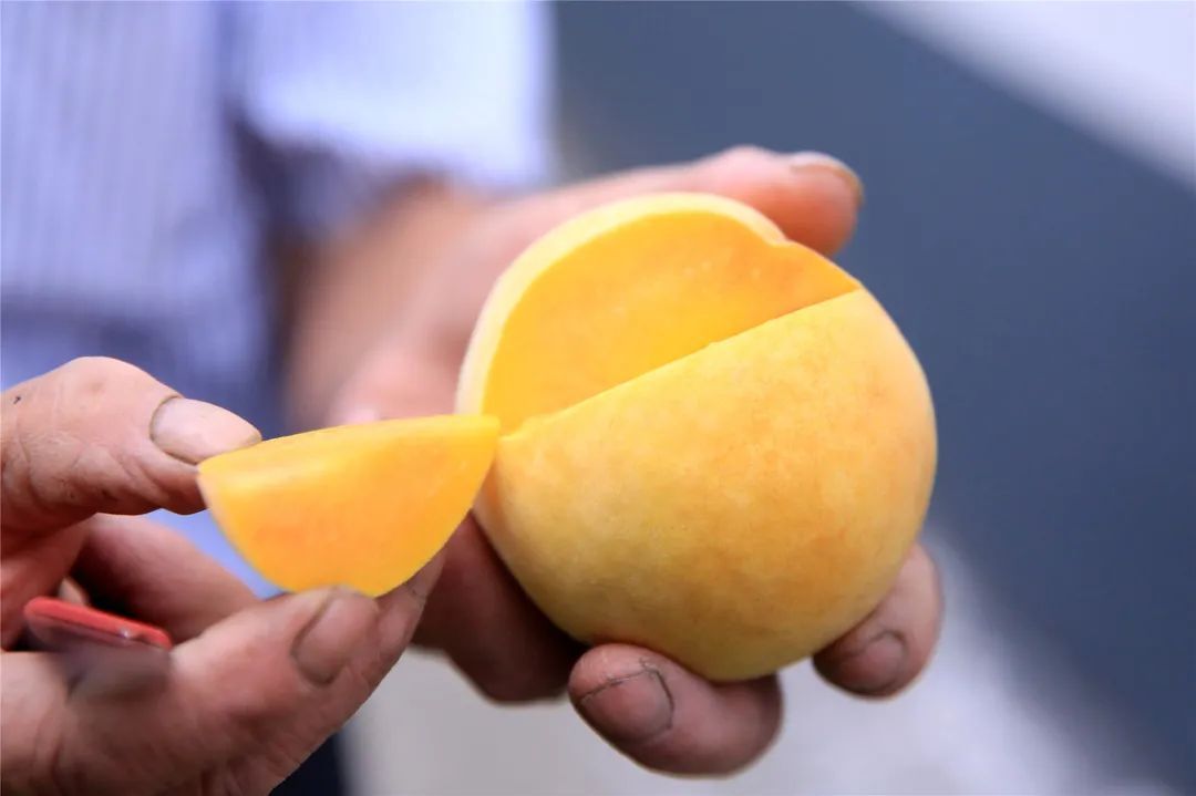 随手摘下一只成熟的黄桃,切一块入口,果肉的甜香在唇齿间萦绕。每只成熟的早黄桃重量在8两左右,个别能长到1斤多。