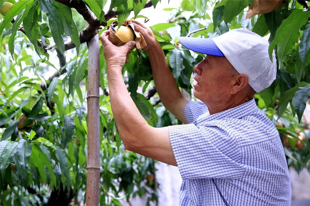 这两天,华亭镇毛桥村的早黄桃迎来了成熟期。桃园内,一只只又大又圆的黄桃挂满枝头,果农王老伯正采摘成熟的黄桃。