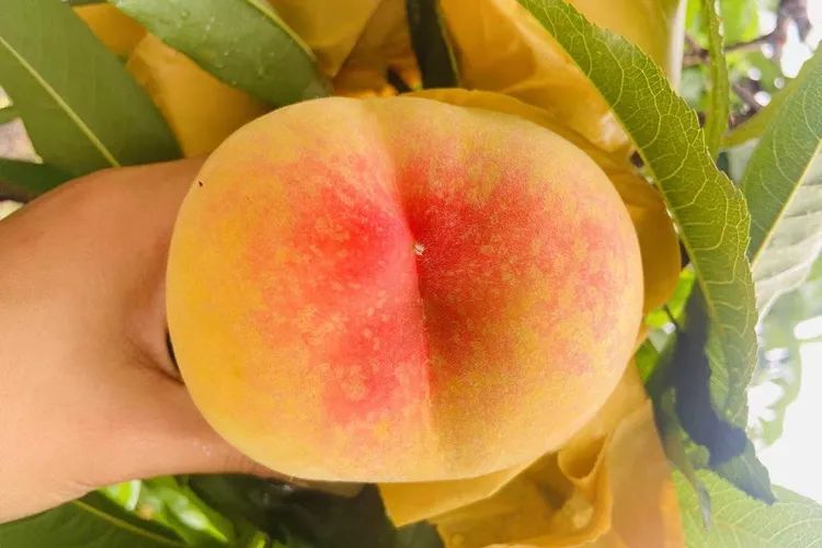 老林介绍,“锦香”属中型果,一般在5两至8两之间,大果可长至1斤,成熟期一般在6月中上旬。“成熟期由于雨水多容易裂果,还会影响口感,所以今年早早地就给快成熟的桃子套上了油纸。”目前,四季果园共种植了5亩“锦香”,日产量达2000斤左右。
