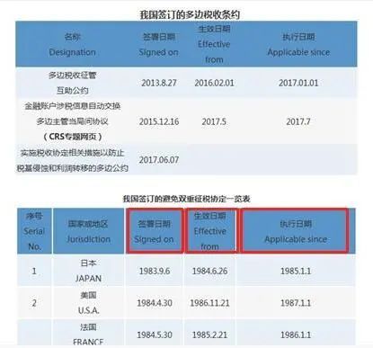 专栏界面,全面展示了我国对外签订的税收条约或协定。在该界面,展示了具体某个协定的签署日期、生效日期和执行日期。