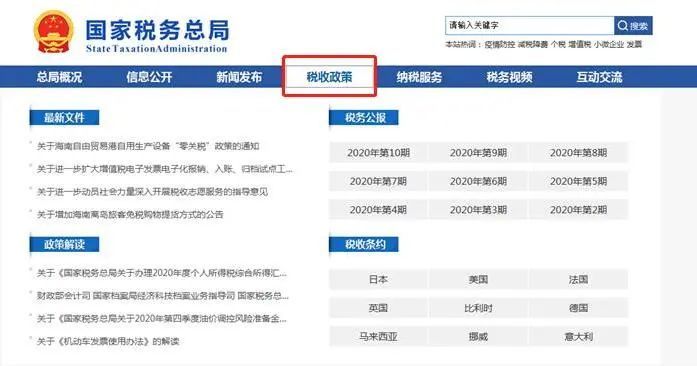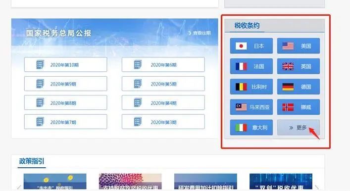 下拉滚动条,页面右侧出现“税收条约”专栏,若页面未出现你要寻找的对应国家协定,请点击“更多”。
