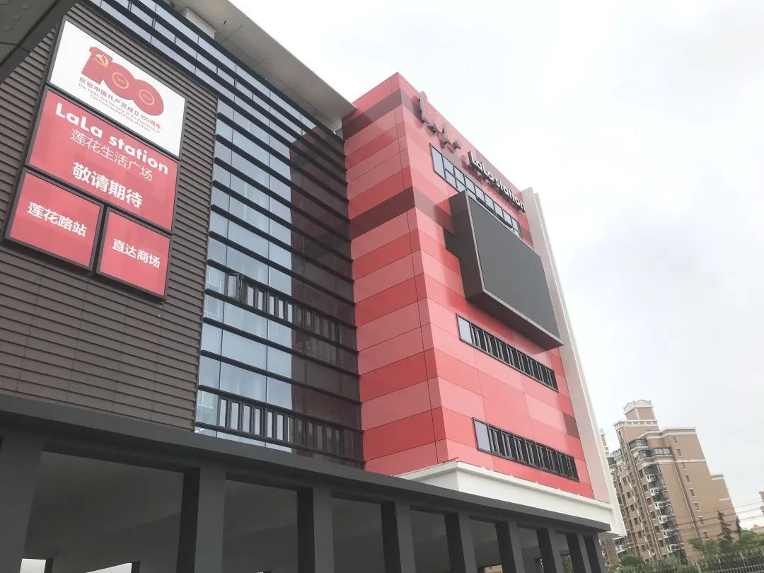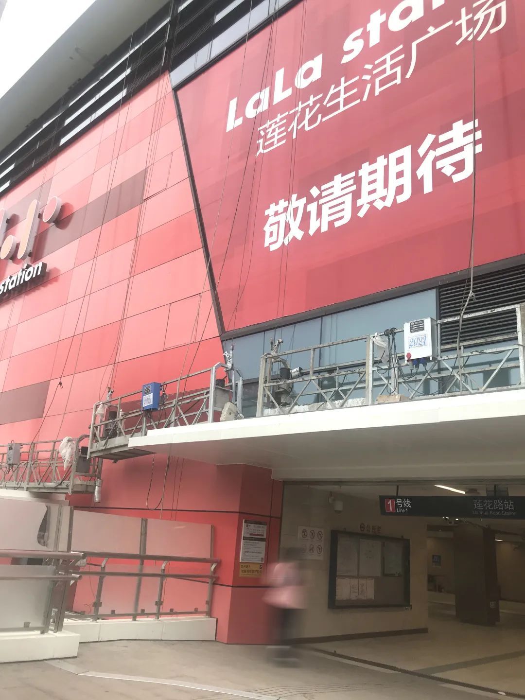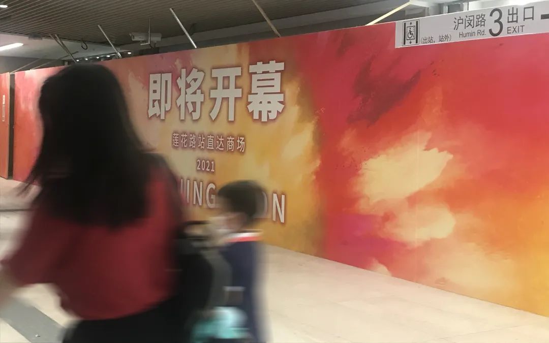原来的莲花路地铁站一楼外立面已经被层层围了起来,建筑工人们正在紧罗密布地进行施工。2层的车站内,“莲花路站直达商场即将开幕的”广告牌放在了最醒目的标志。
