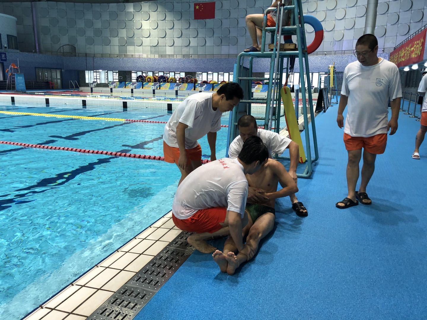 此次演练分为模拟溺水、现场救援等环节。现场模拟了游泳者遭遇溺水,演练人员发现后及时下水救援。在救援中,演练人员根据情况对“溺水者”实施拖拽救助。到达泳池边后,发现“溺水者”已神志不清,演练人员一边对其进行心肺复苏急救,一边示意巡边救生员立即拨打120求救电话。