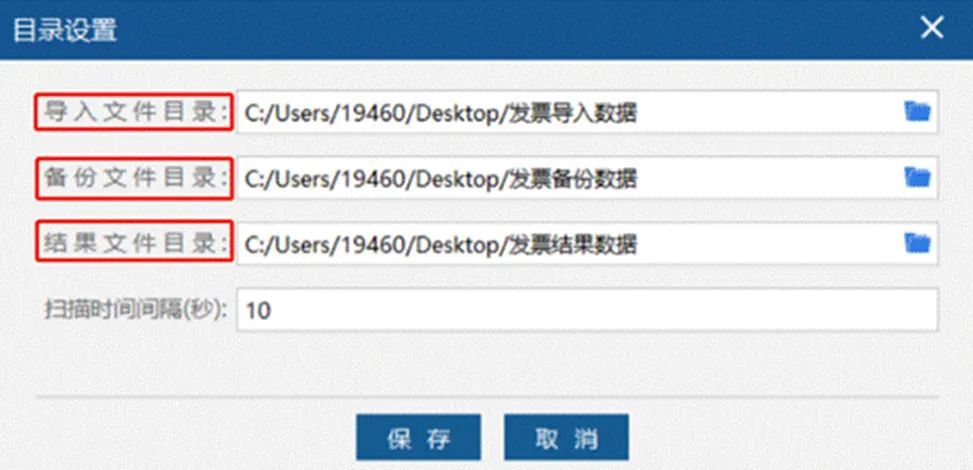 首次开具需进行目录设置,指定发票文件存放目录。“扫描时间间隔(秒)”用来设置读取每个文件的间隔时间,用户可根据需要自行设置。