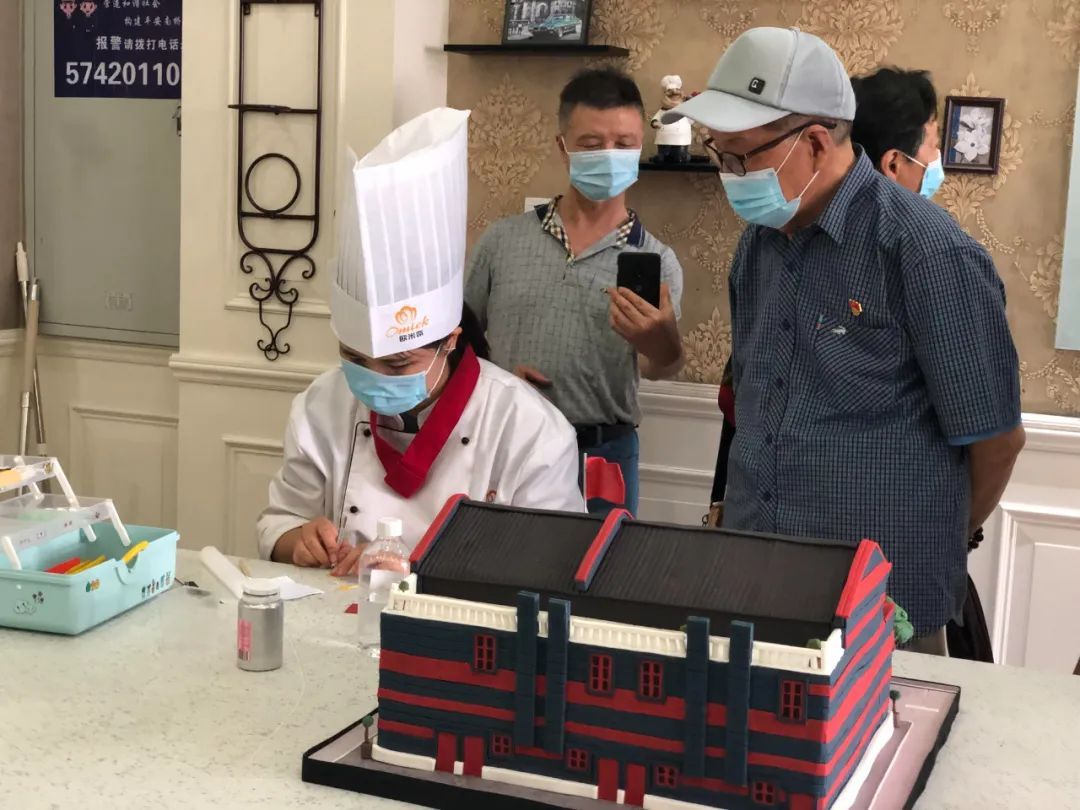 走进欧米奇(西点)培训学校的教室里,随着蛋糕师灵巧的雕刻,几分钟后,一面由翻糖制作的栩栩如生的党旗跃然桌上。而在蛋糕师面前的这栋“建筑物”,让前来参观的老党员们不由纷纷停下脚步。从路牌、门牌号到窗户、墙砖…处处都是精致的细节,看起来像一个建筑模型,实则是一块由翻糖制作而出的蛋糕。一位有着60年党龄的84岁老党员,一眼就认出了这栋红色建筑物。