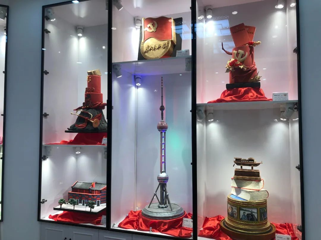 不止是中共一大会址,在学校的展示柜里,还摆放着各类生动的“红色”蛋糕,非常吸睛。前来参观的党员们纷纷拿出手机拍摄,年轻的80后党员小沈也非常触动,对于这些一比一真实还原的蛋糕作品,她感慨:“一直以来只觉得这是个蛋糕培训学校,但是没想到他们能把红色景点和红色精神通过他们一双巧手,把它做成了栩栩如生的作品。”