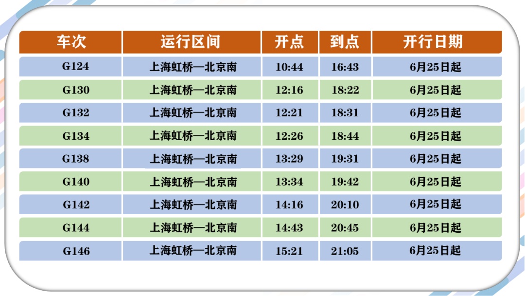 新图实施后,全站京沪高铁进京列车总列对为45对,增加1对。