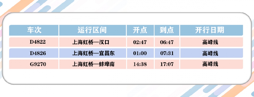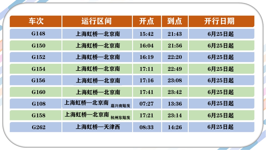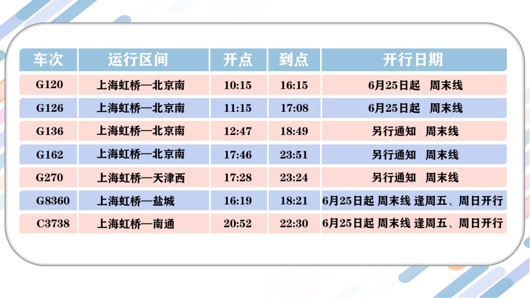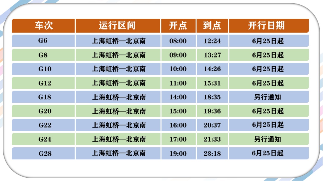 虹桥站增加2对,共9对,出发车次分别为G6、G8、G10、G12、G18、G20、G22、G24、G28次,全部为准点出发。