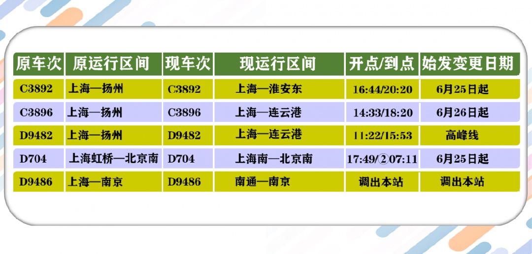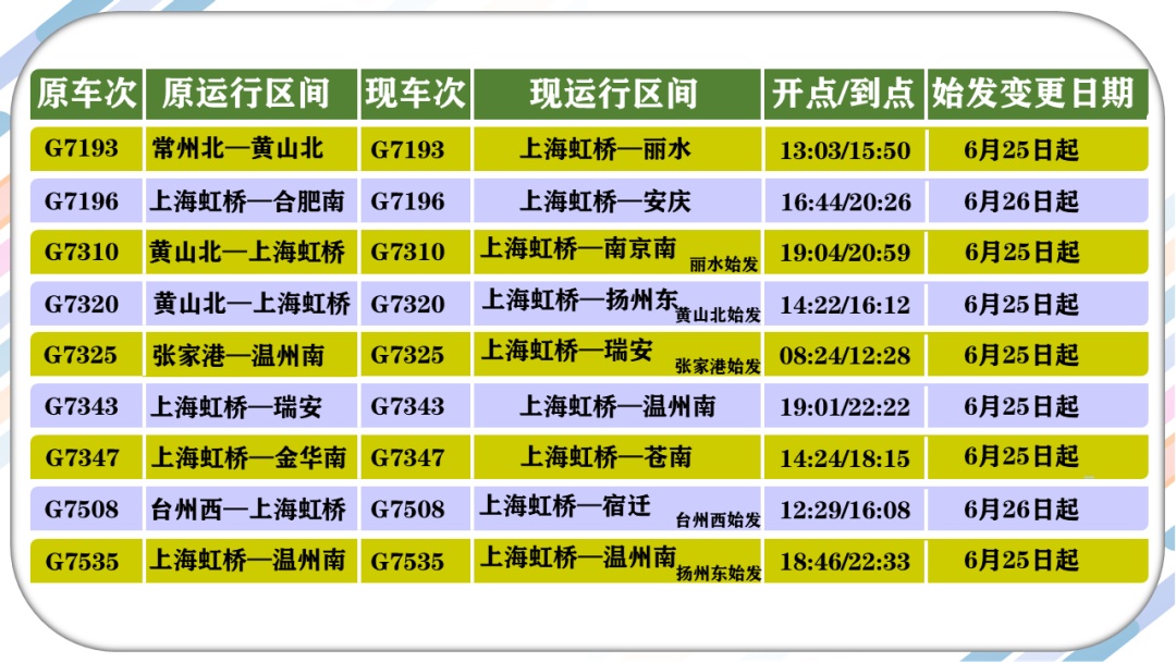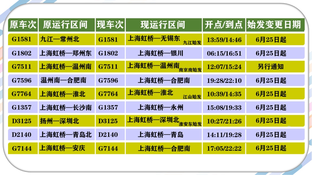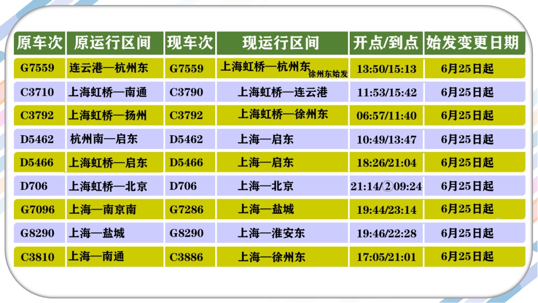 上海铁路局说,6月25日零时起,铁路上海站将实行第三季度列车运行图。新图实施后,上海直属站共开行列车583对,创开站以来历史新高。同时优化调整了列车开行方案,如京沪高速线进京达速列车进一步增加,上海至许昌首通直达高铁,上海南站首次开行北京动卧等,提高了旅客出行的便捷性。详见↓